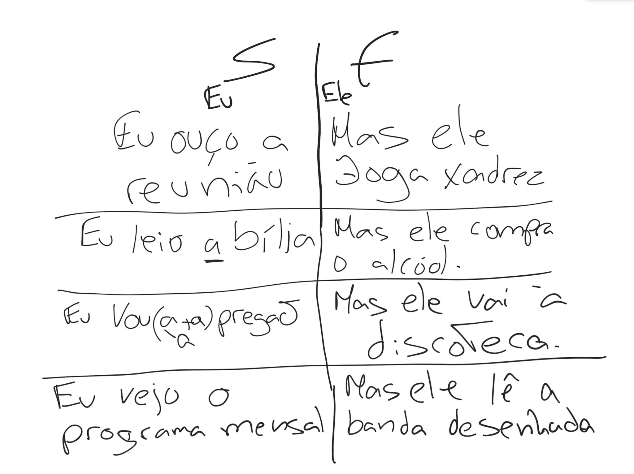 - Verbs in quadrants (coupled with mimicking) – use things in kitchen with comer, beber, ficar (contente, triste, maluco, zangado), chamar, conhecer